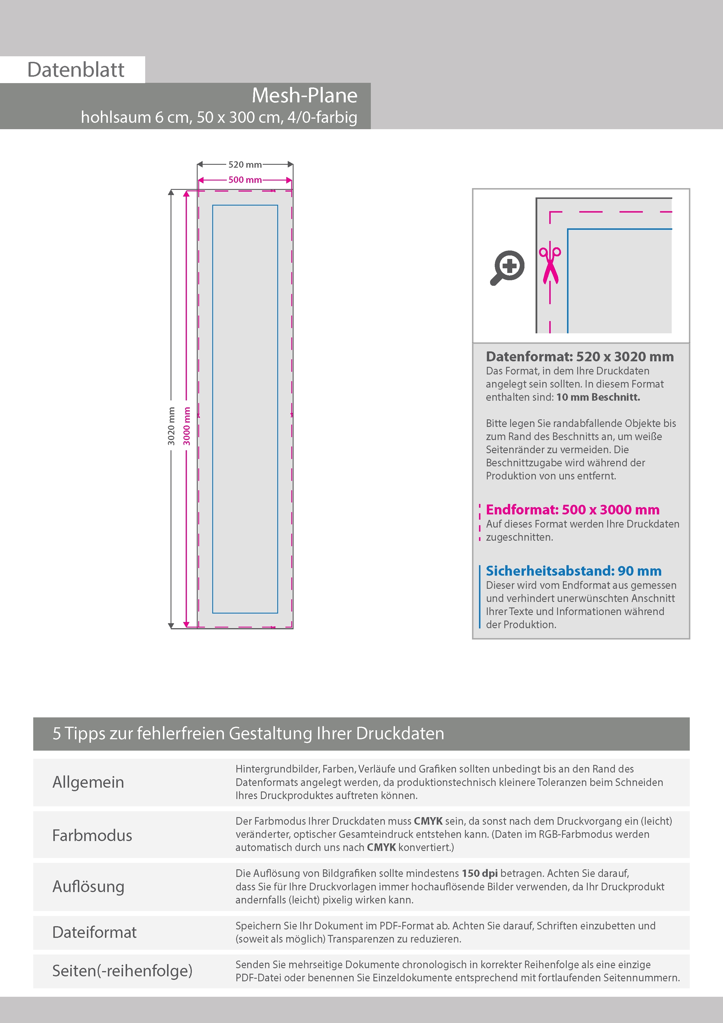 Hochwertige Mesh-Plane 50 x 300 cm, 4/0-farbig bedruckt, Hohlsaum links und rechts (Durchmesser Hohlsaum 6,0 cm)