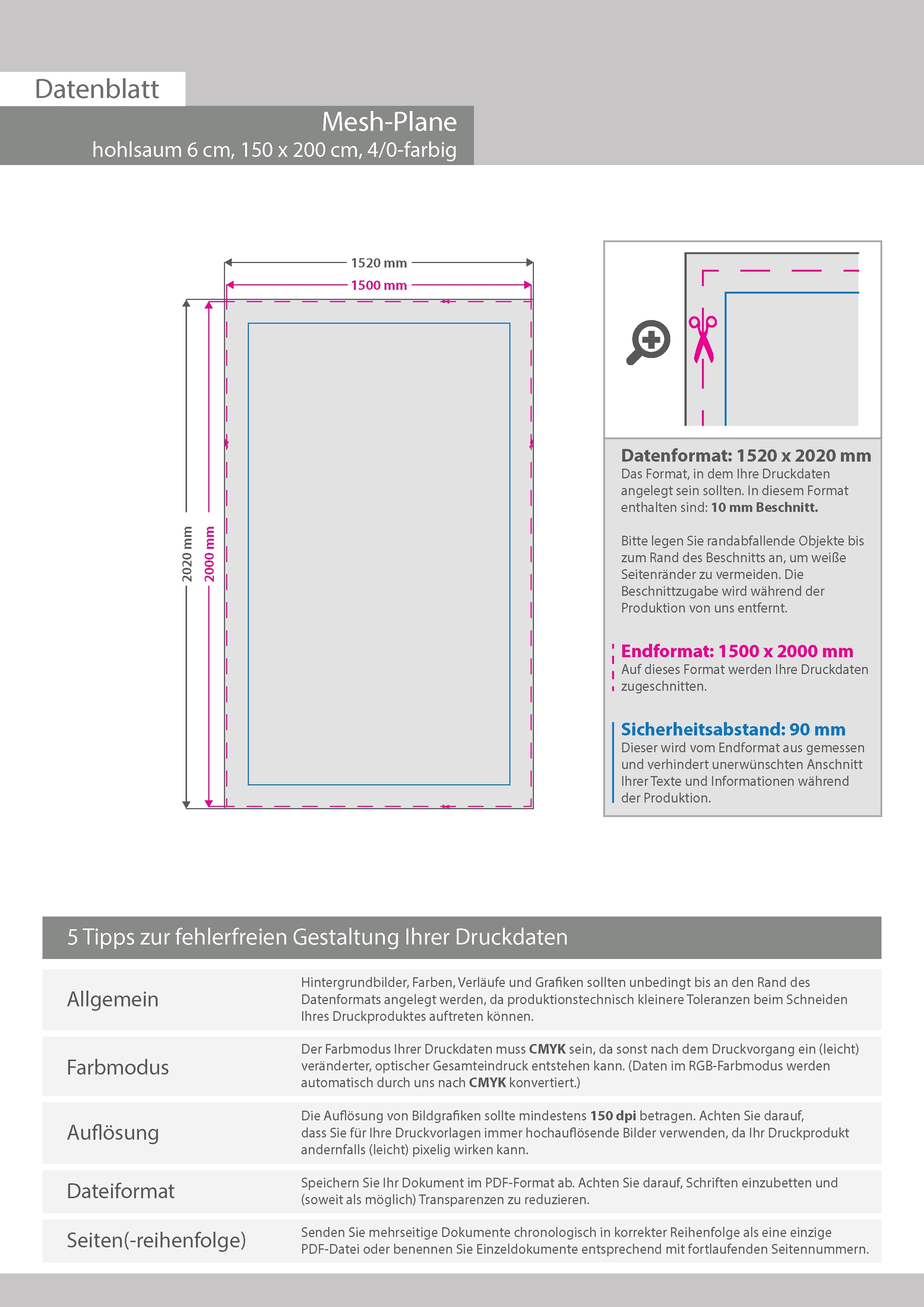 Hochwertige Mesh-Plane 150 x 200 cm, 4/0-farbig bedruckt, Hohlsaum links und rechts (Durchmesser Hohlsaum 6,0 cm)