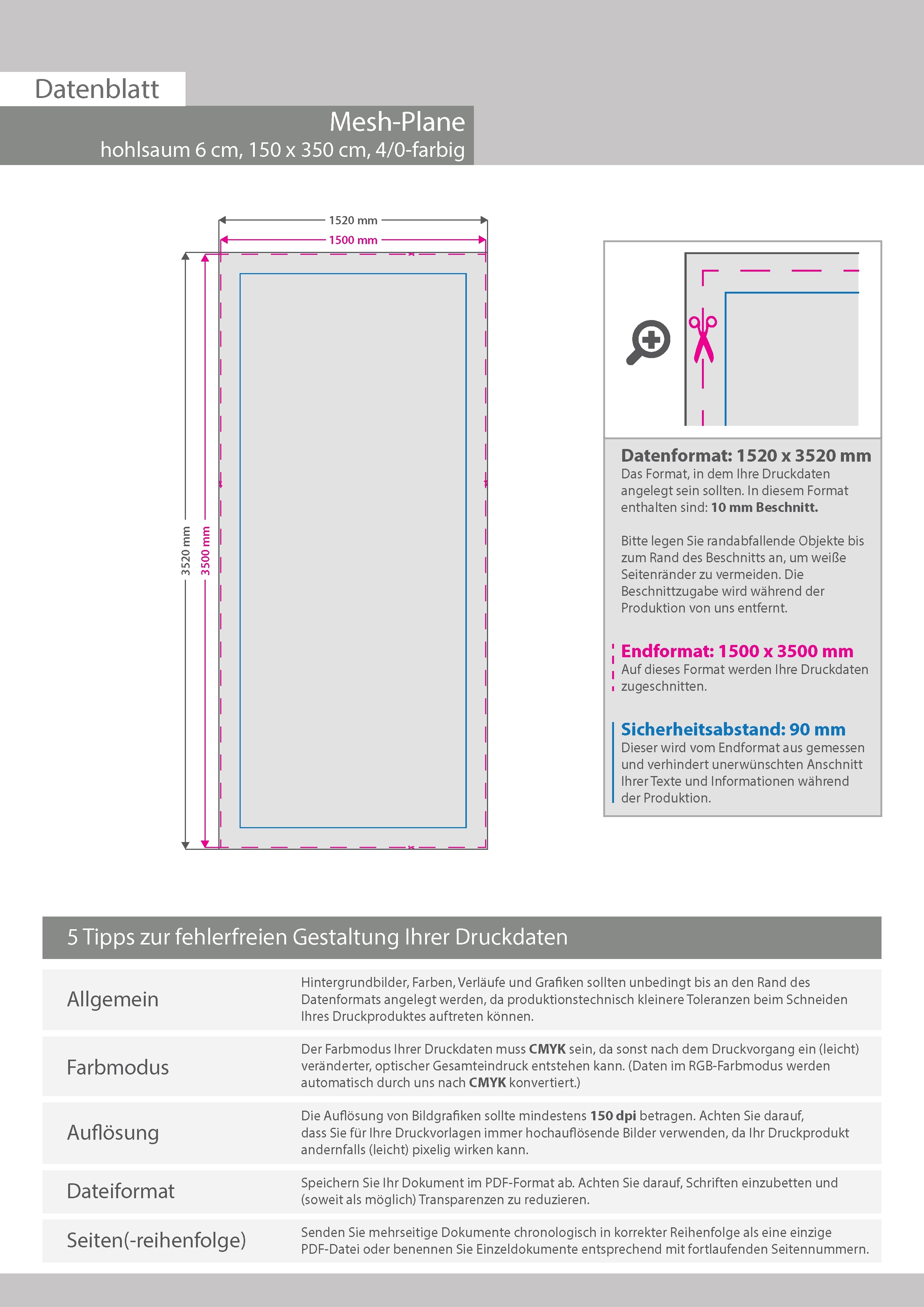 Hochwertige Mesh-Plane 150 x 350 cm, 4/0-farbig bedruckt, Hohlsaum links und rechts (Durchmesser Hohlsaum 6,0 cm)