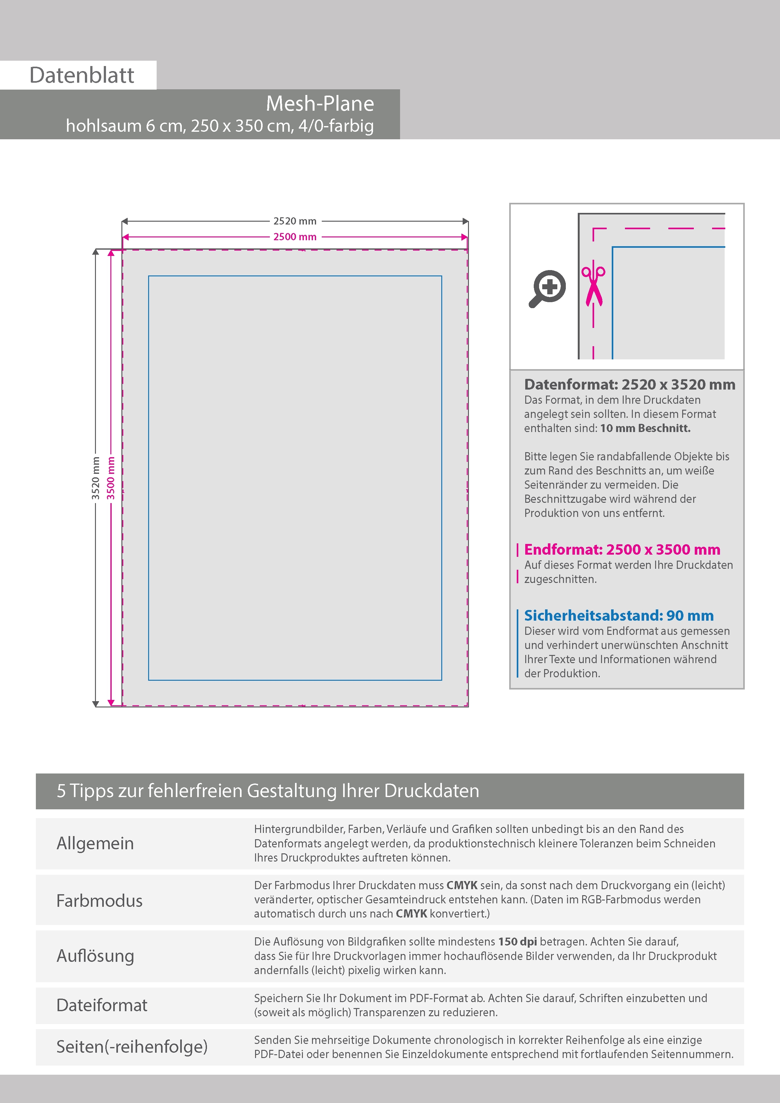 Hochwertige Mesh-Plane 250 x 350 cm, 4/0-farbig bedruckt, Hohlsaum links und rechts (Durchmesser Hohlsaum 6,0 cm)