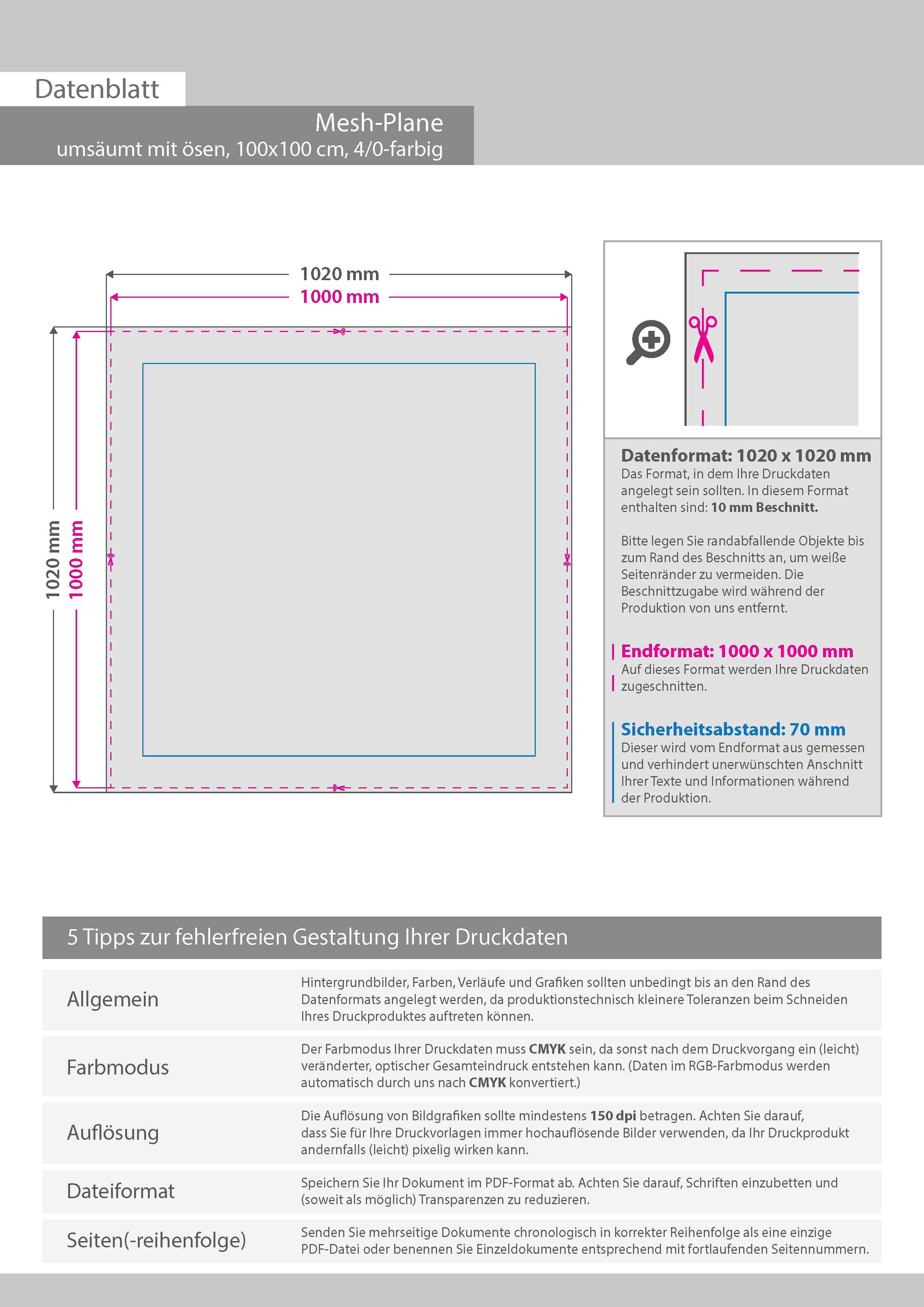 Hochwertige Mesh-Plane (PVC-frei), 100 x 100 cm, 4/0-farbig bedruckt, Umsäumt + Ösen im Abstand von 50 cm oben und unten