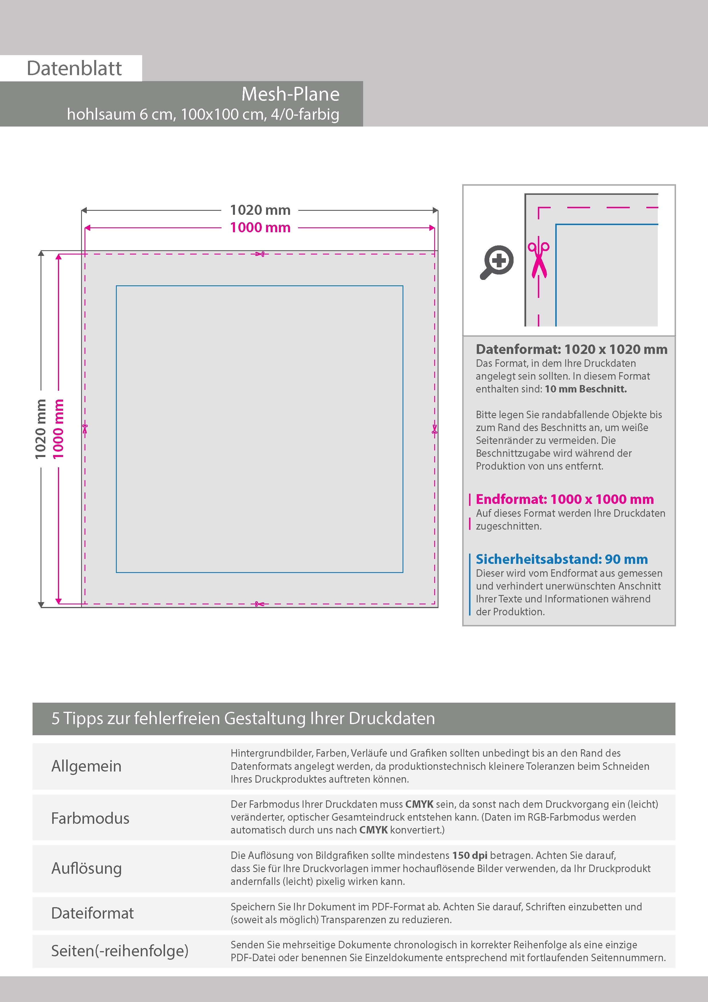 Hochwertige Mesh-Plane (PVC-frei), 100 x 100 cm, 4/0-farbig bedruckt, Hohlsaum oben und unten (Durchmesser Hohlsaum 6,0 cm)