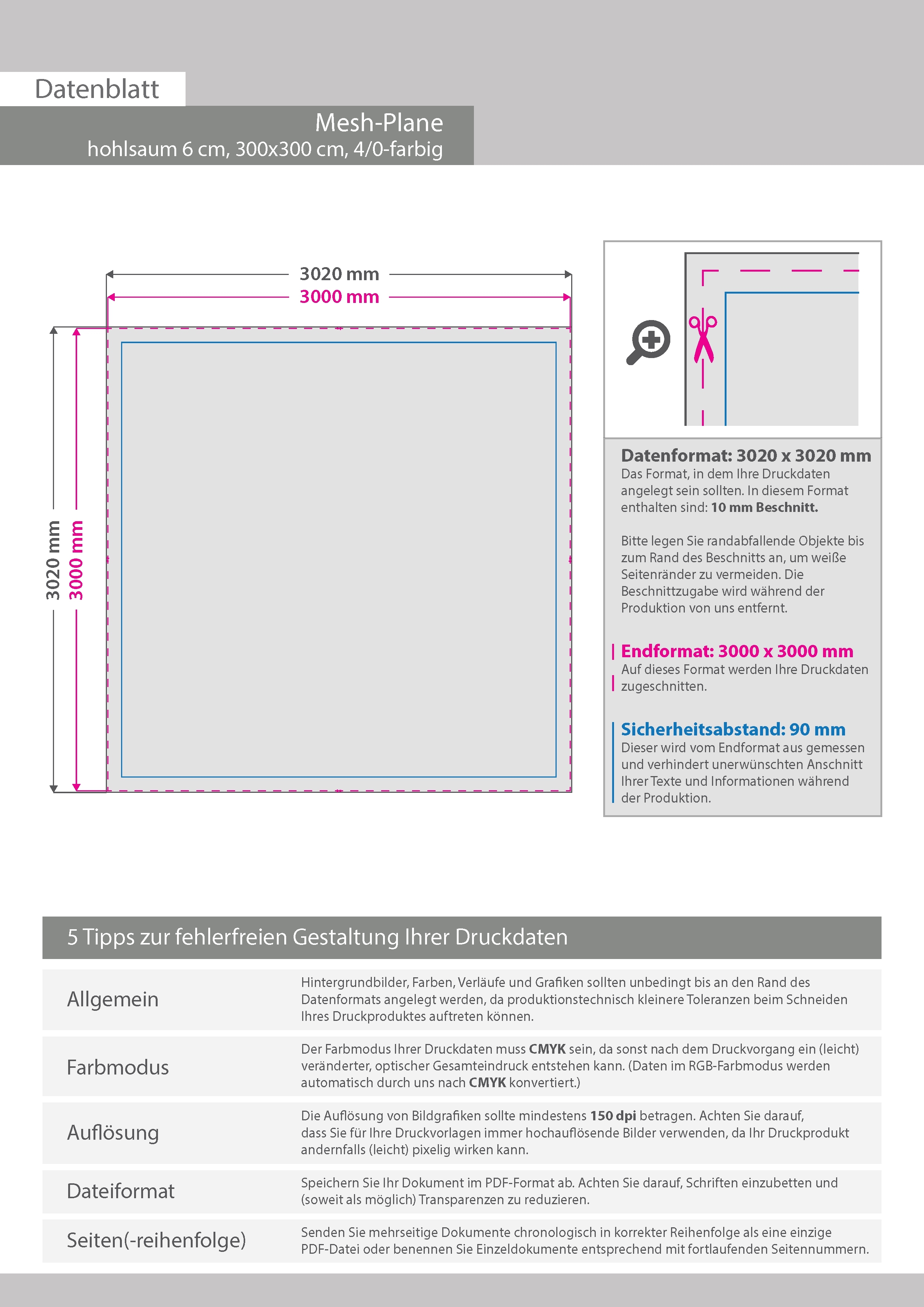 Hochwertige Mesh-Plane (PVC-frei), 300 x 300 cm, 4/0-farbig bedruckt, Hohlsaum oben und unten (Durchmesser Hohlsaum 6,0 cm)